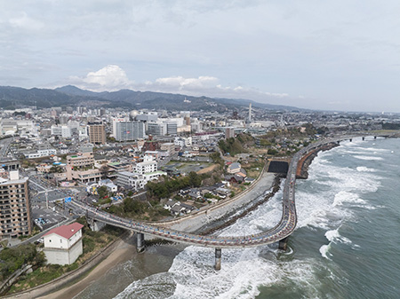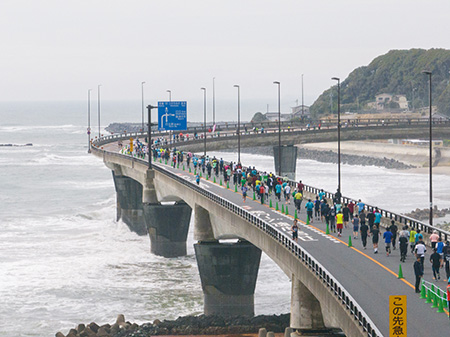 皆さまのチャレンジをお待ちしています。6km~13kmの区間は、太平洋に張り出した自動車専用道を走ります。雄大なオーシャンビューがこの大会の大きな魅力です。